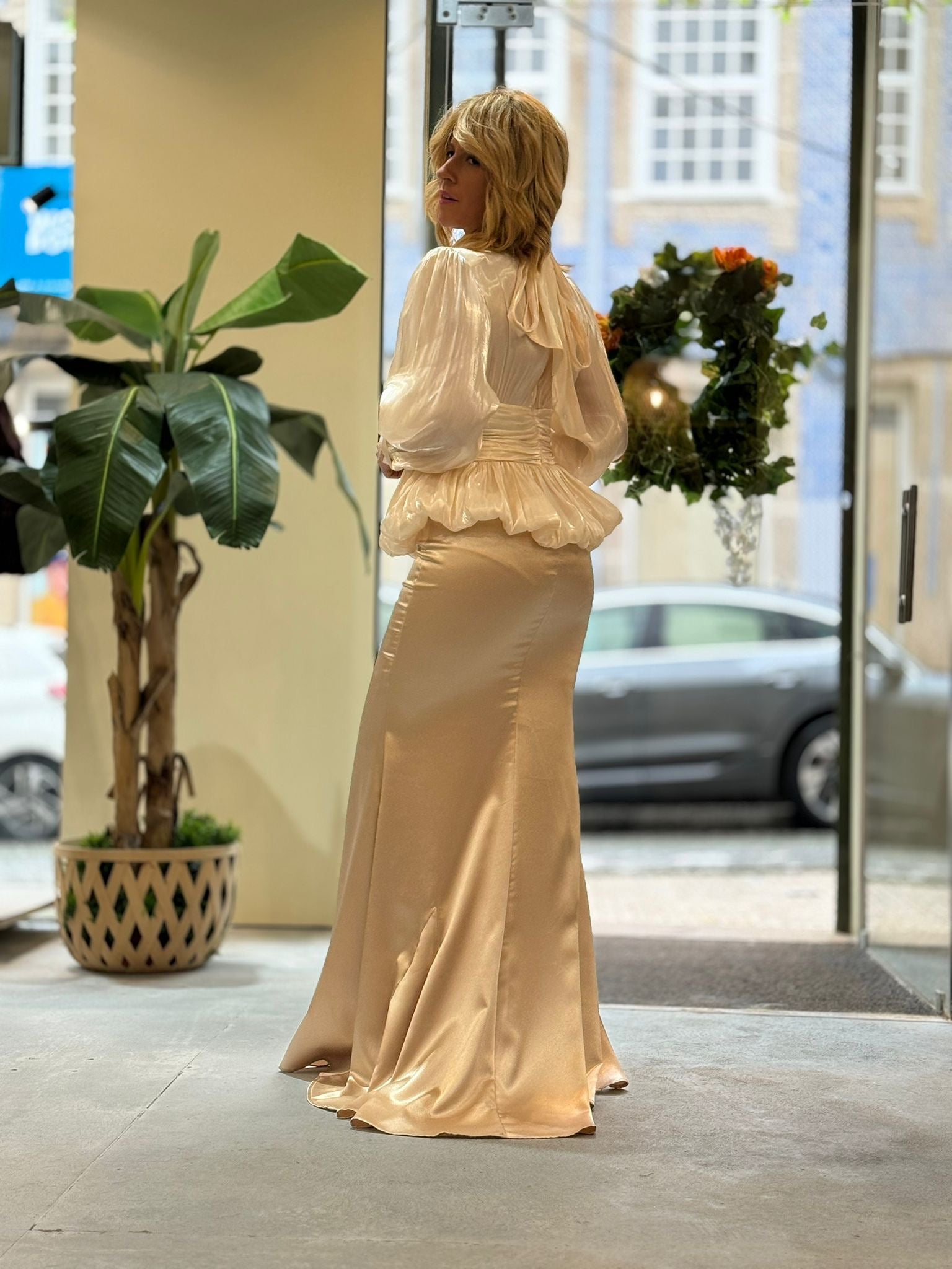 Blusa acetinada com aplicação prateada . Saia dourada acetinada modelo sereia.