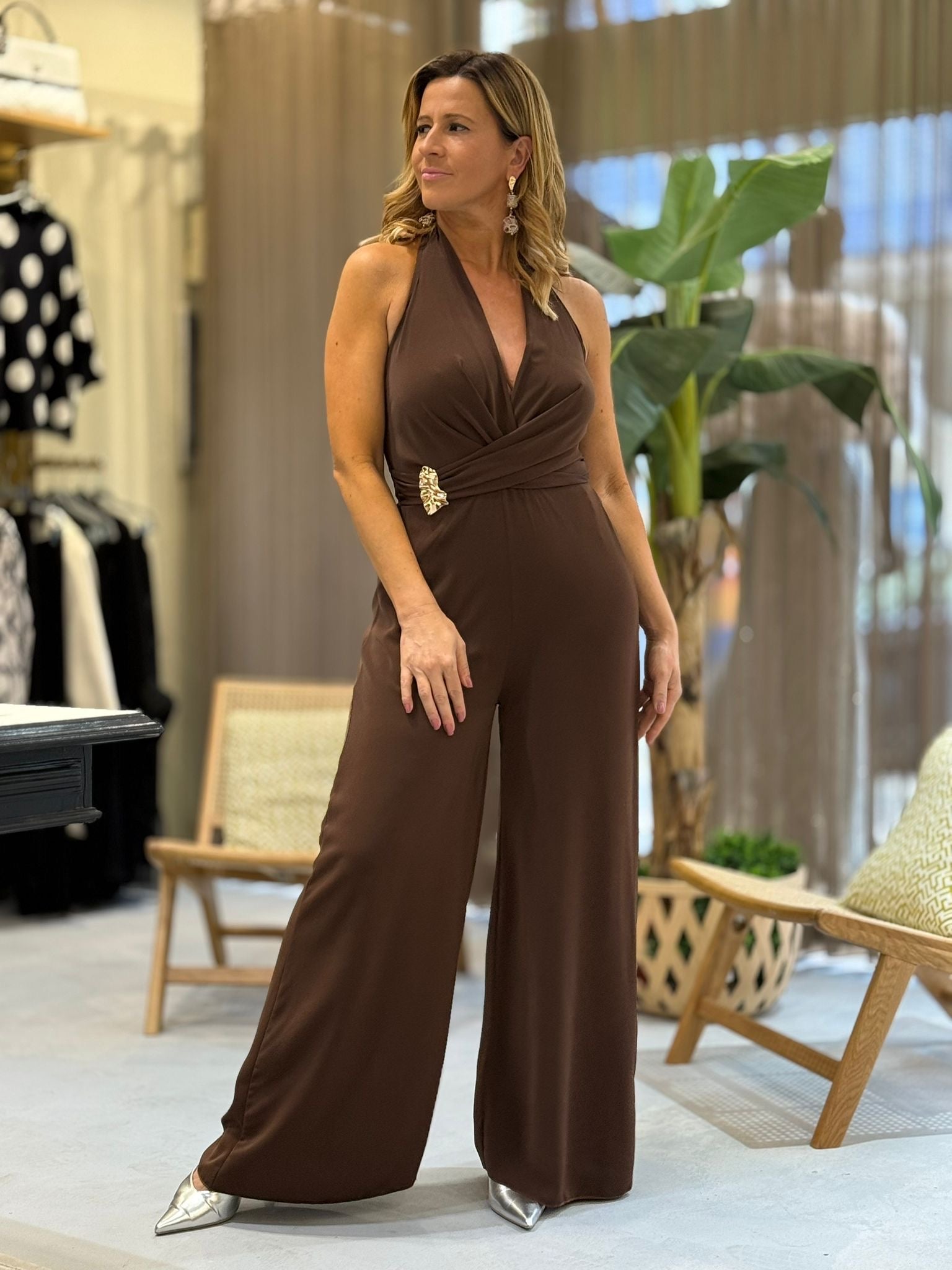 Macacão em tom castanho com aplicação dourada. Costas elásticas adaptando-se ao tamanho.
