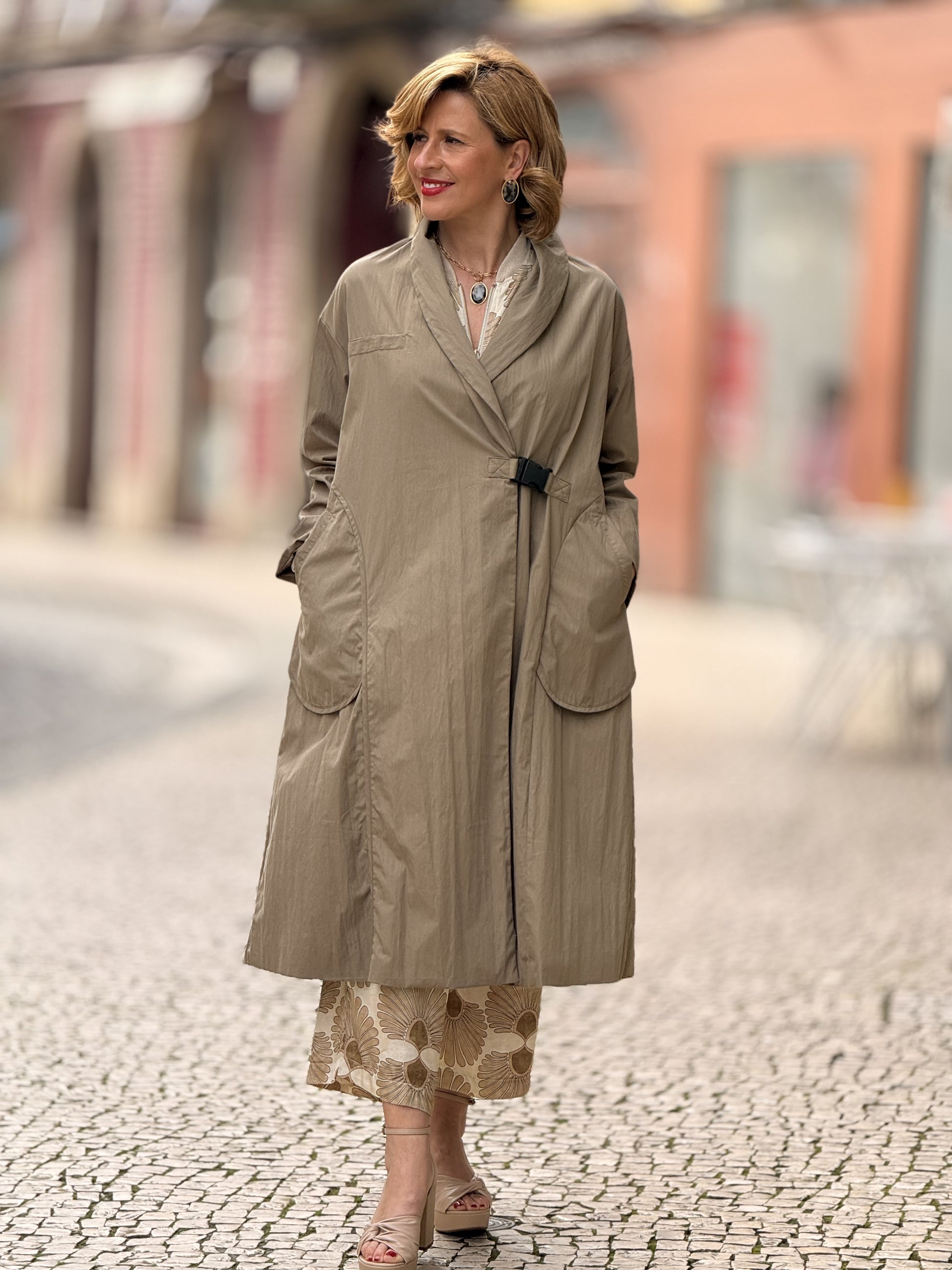 Modelo oversized, com tecido impermeável, leve e fluída.