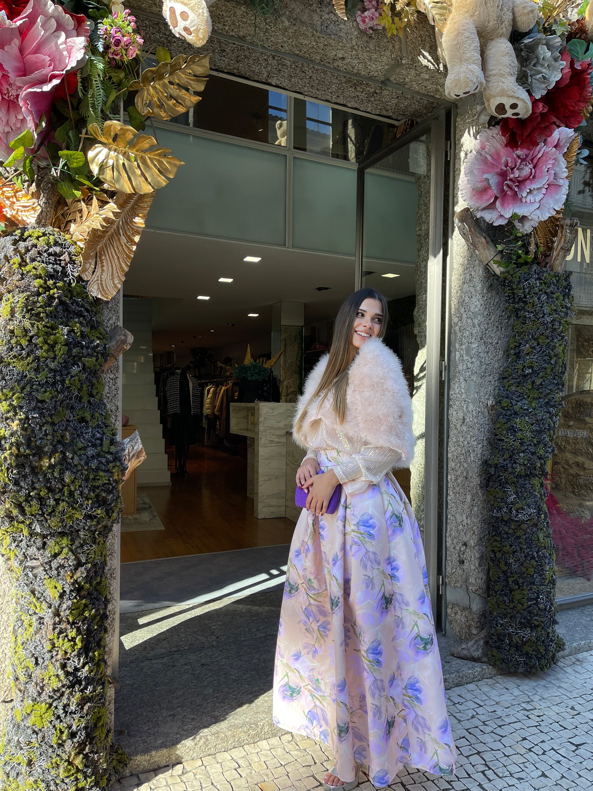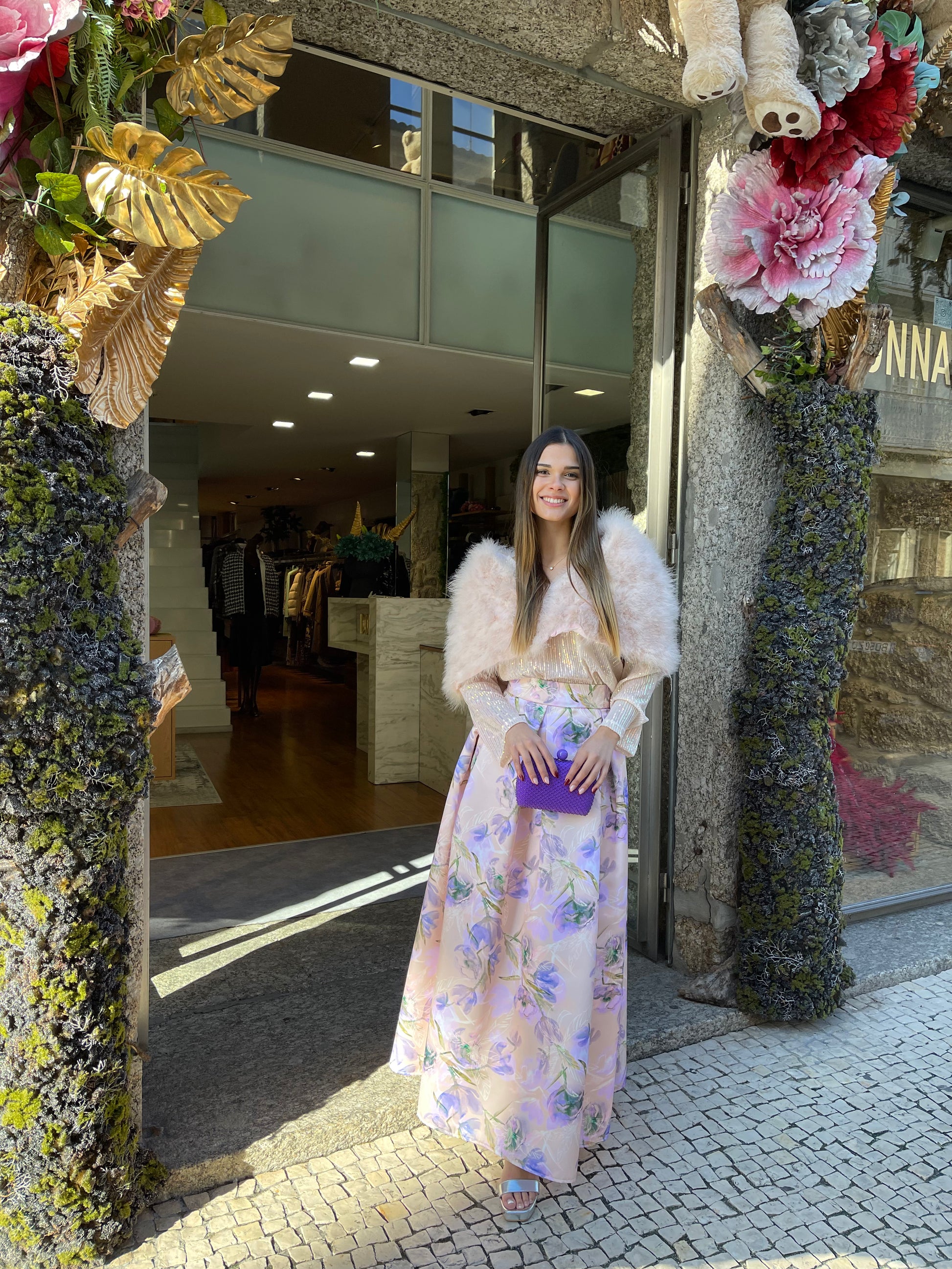 Com um padrão floral em tons neutros de rosa nude, lilás, que combinam lindamente com peças de tom mais nude.