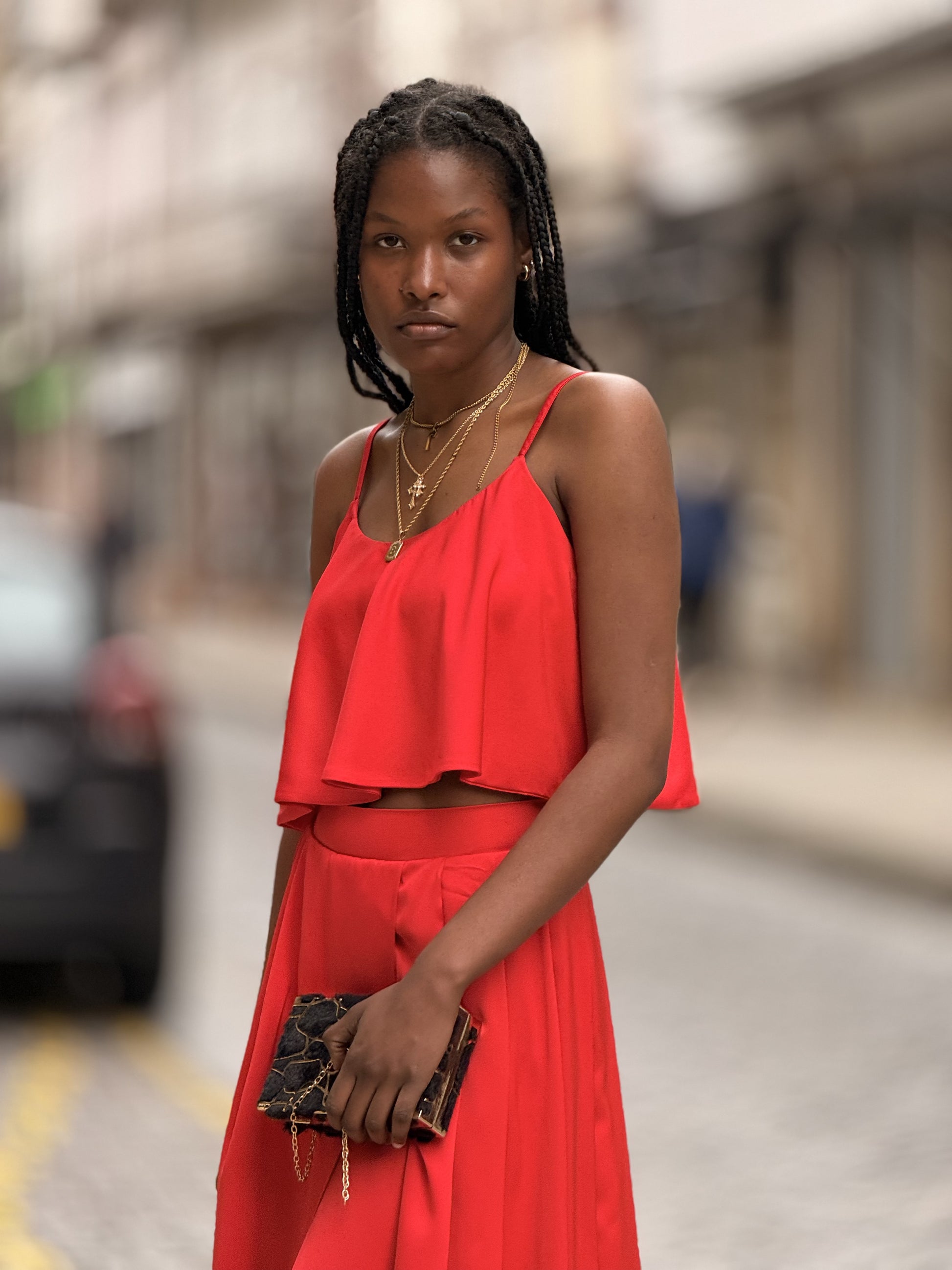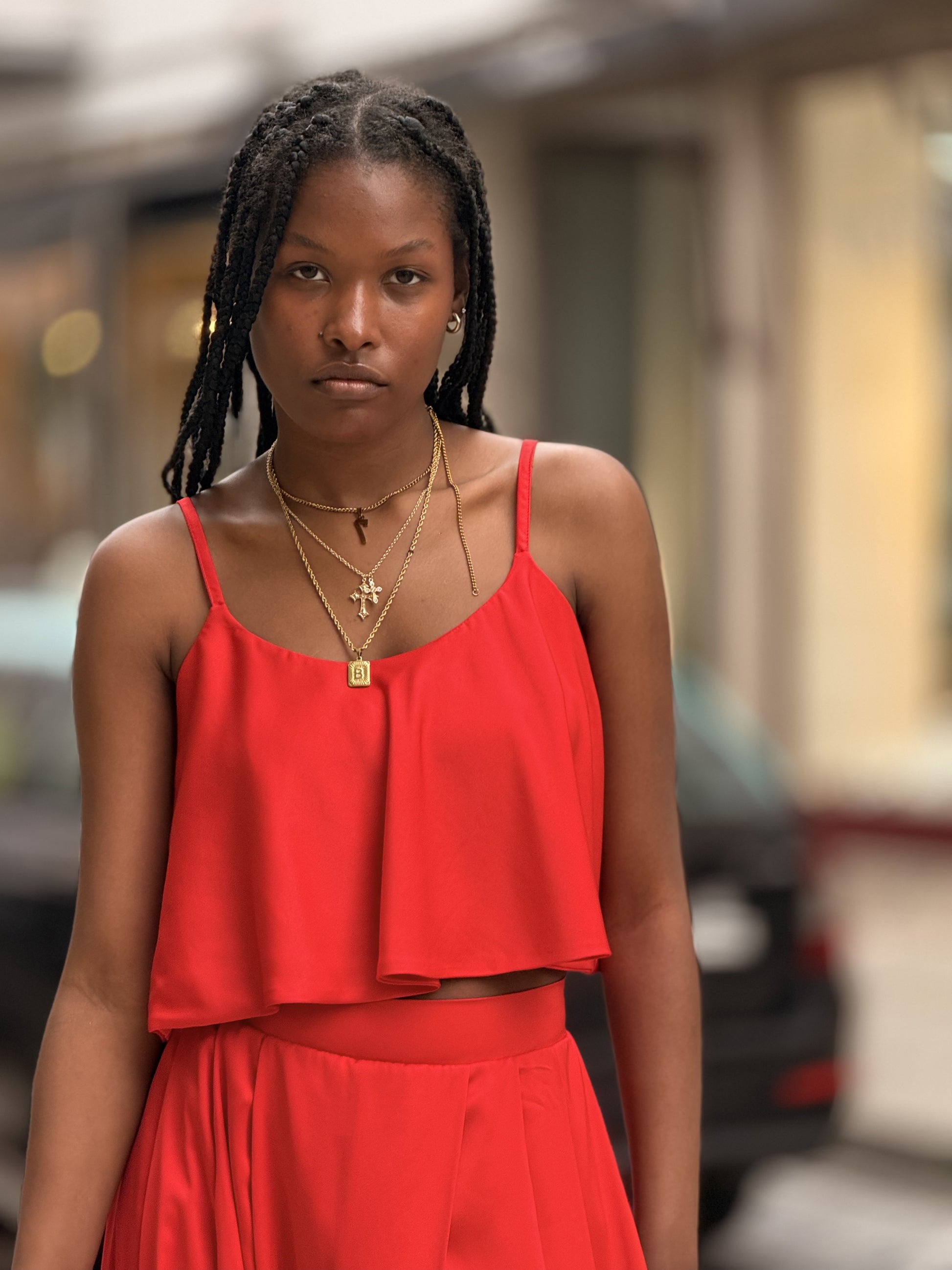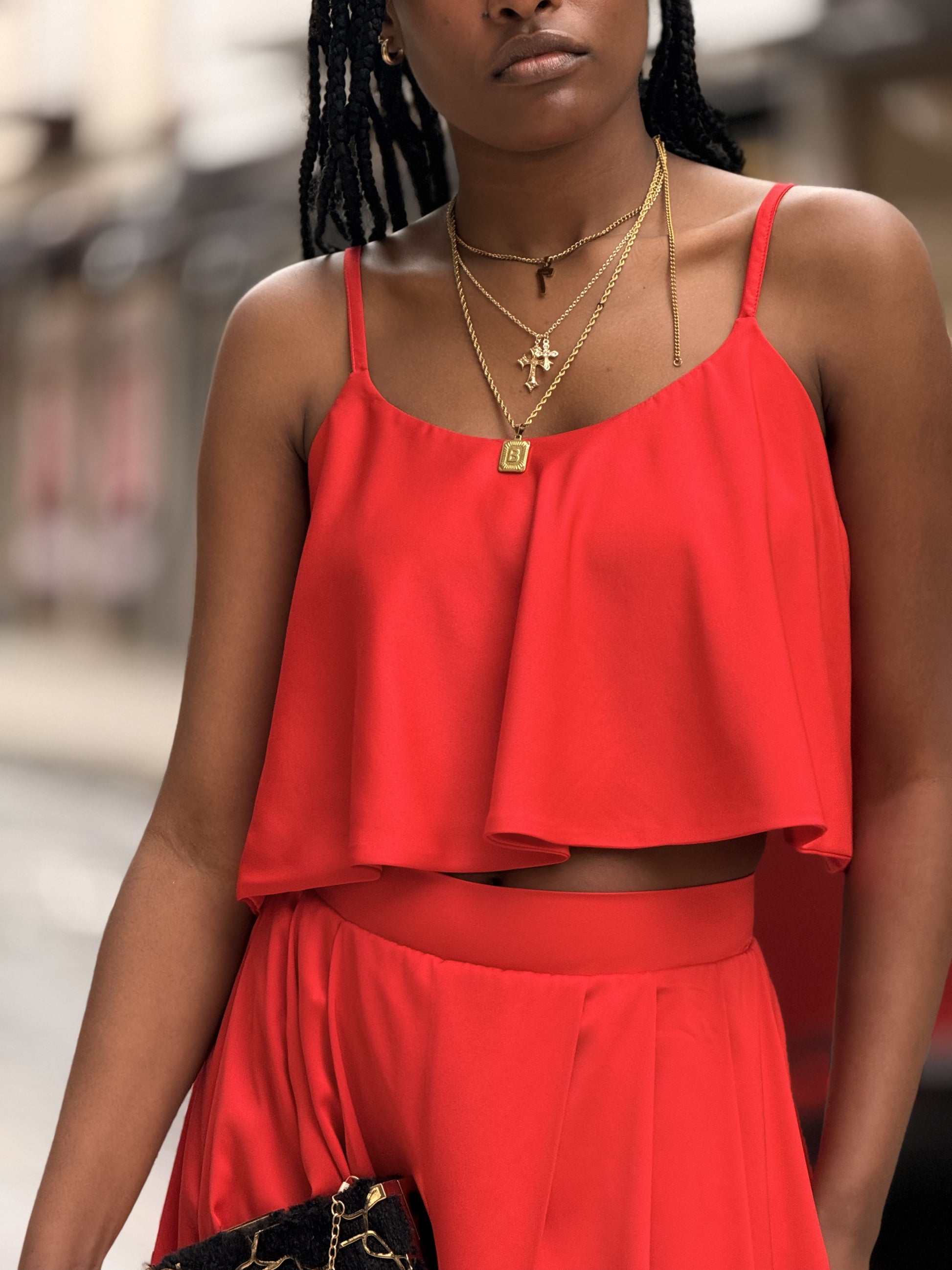 O top, fluído e de cetim, em um tom vermelho clássico, tem um caimento suave que transmite delicadeza e movimento.