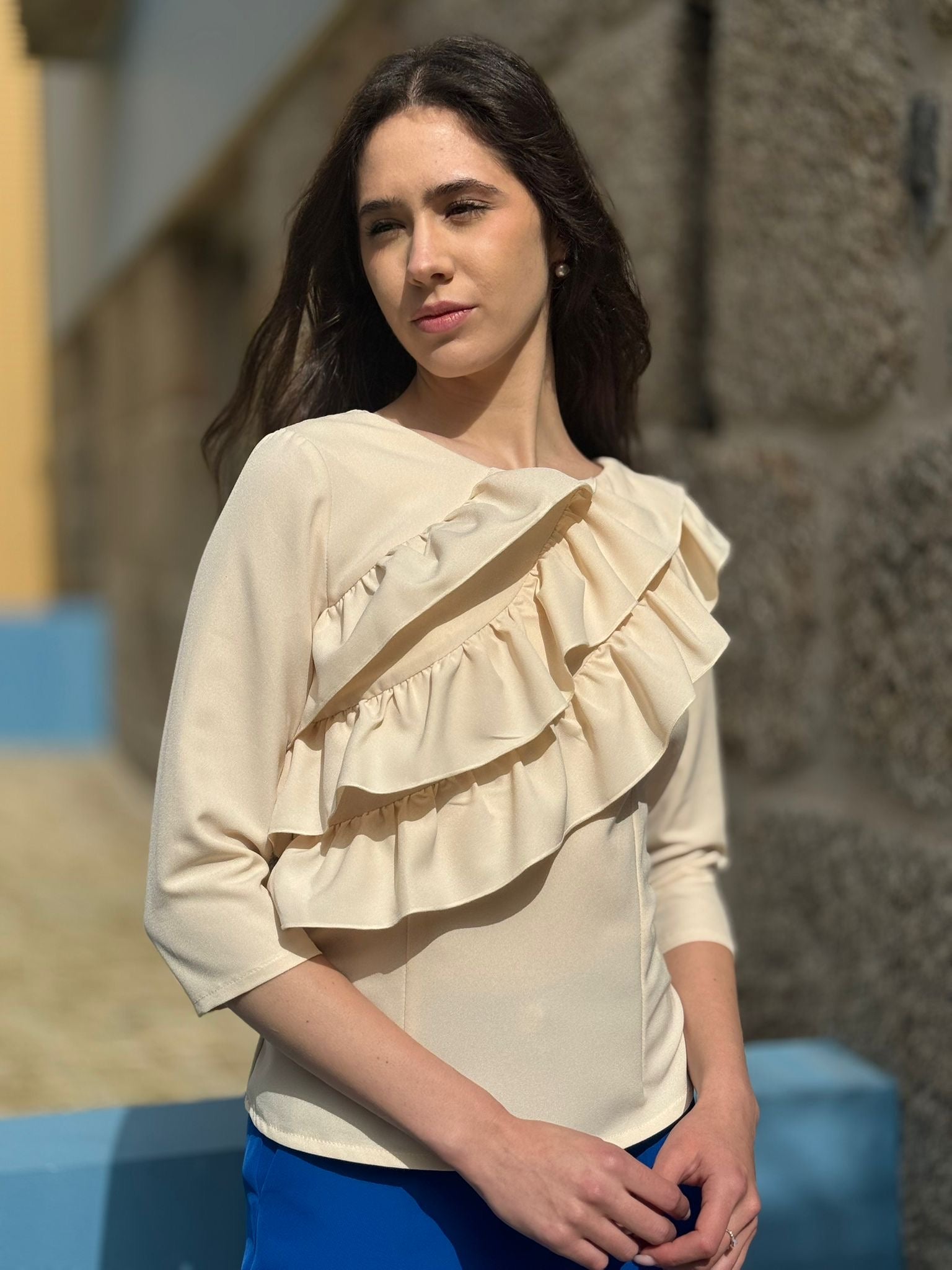Túnica bege com folhos e meia manga. Fecho invisível nas costas .
