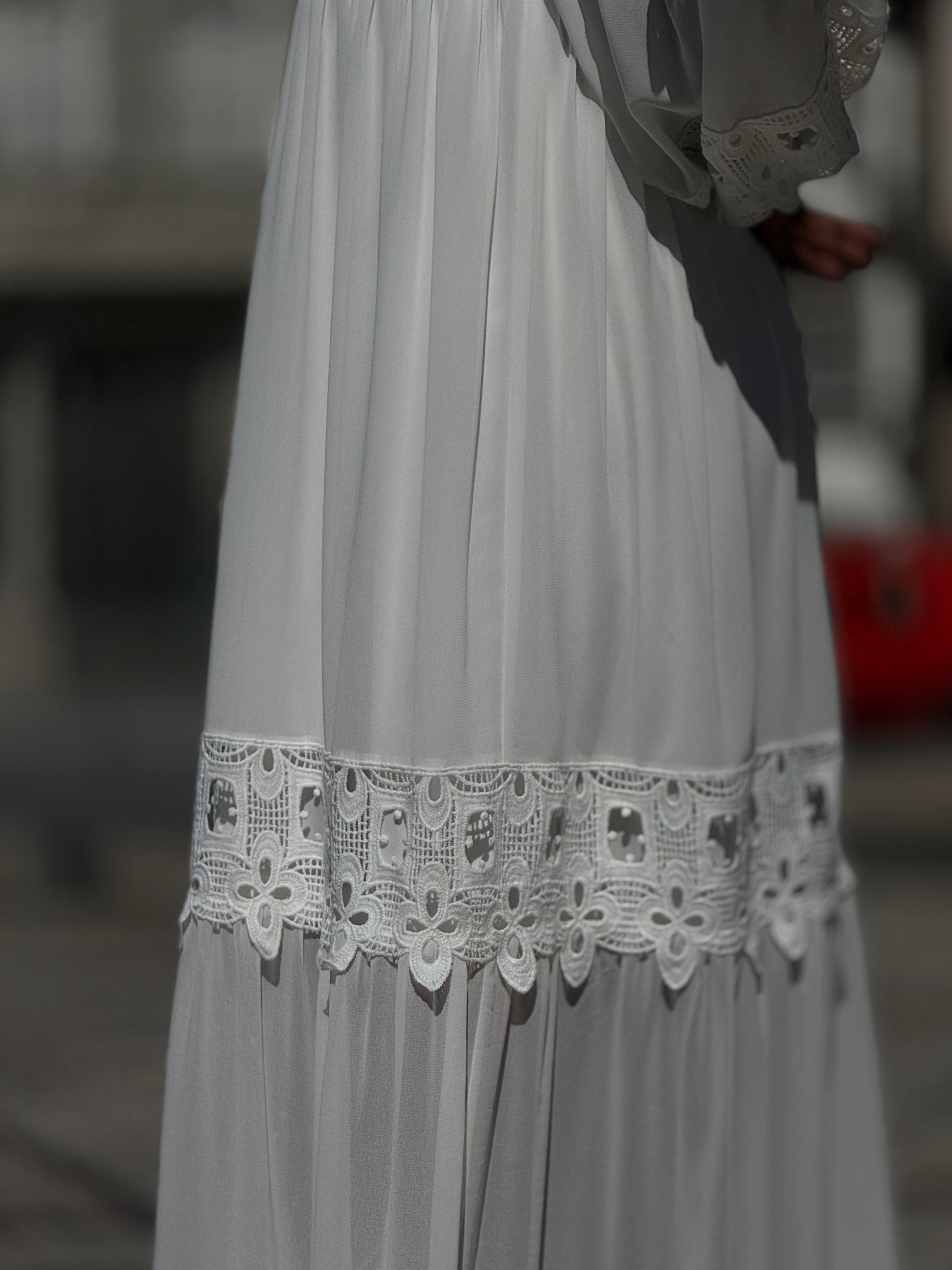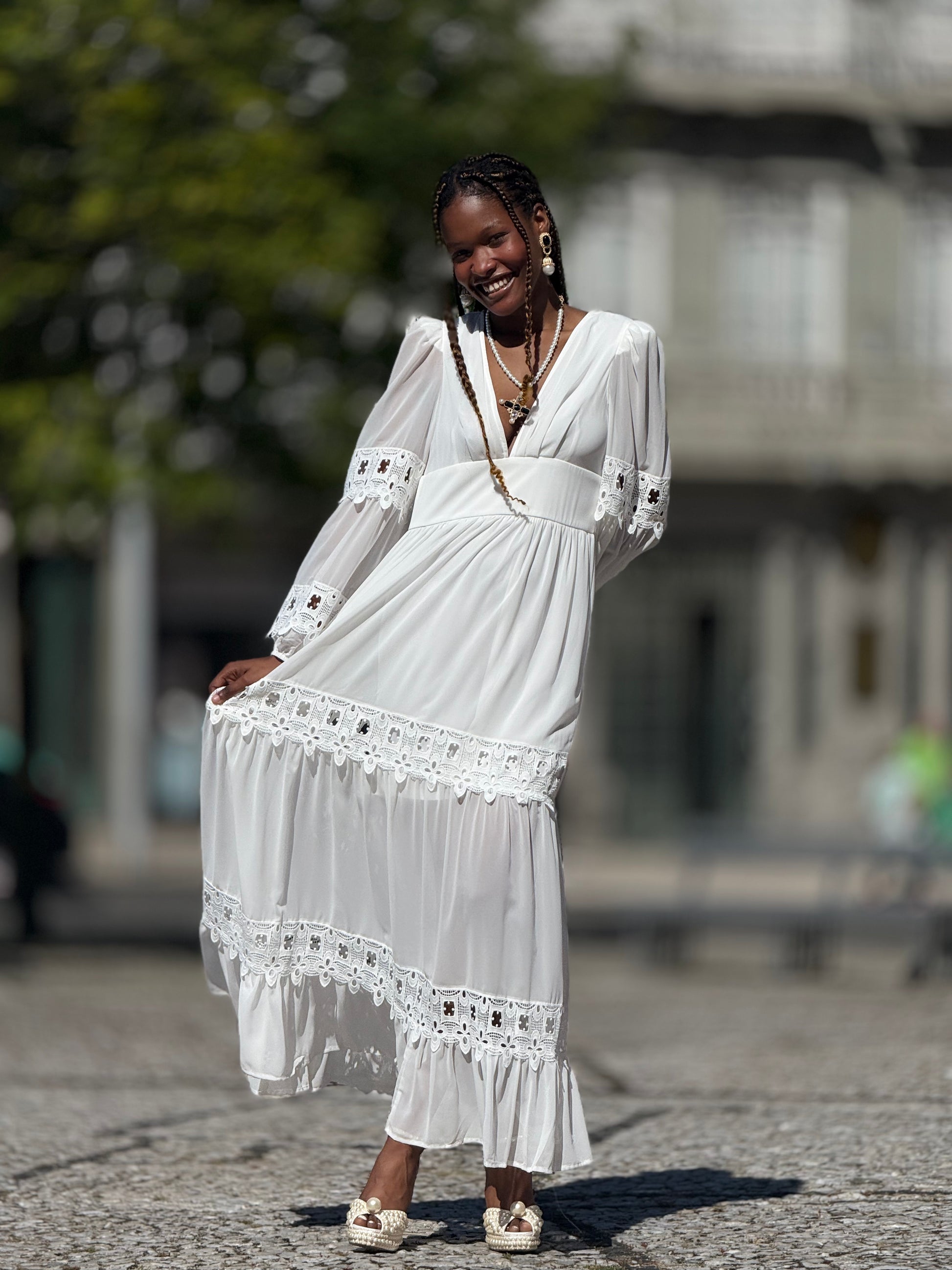 Este vestido longo branco, adornado com renda delicada, é a escolha perfeita para ocasiões especiais, como batizados, festa de anos, evento importante.