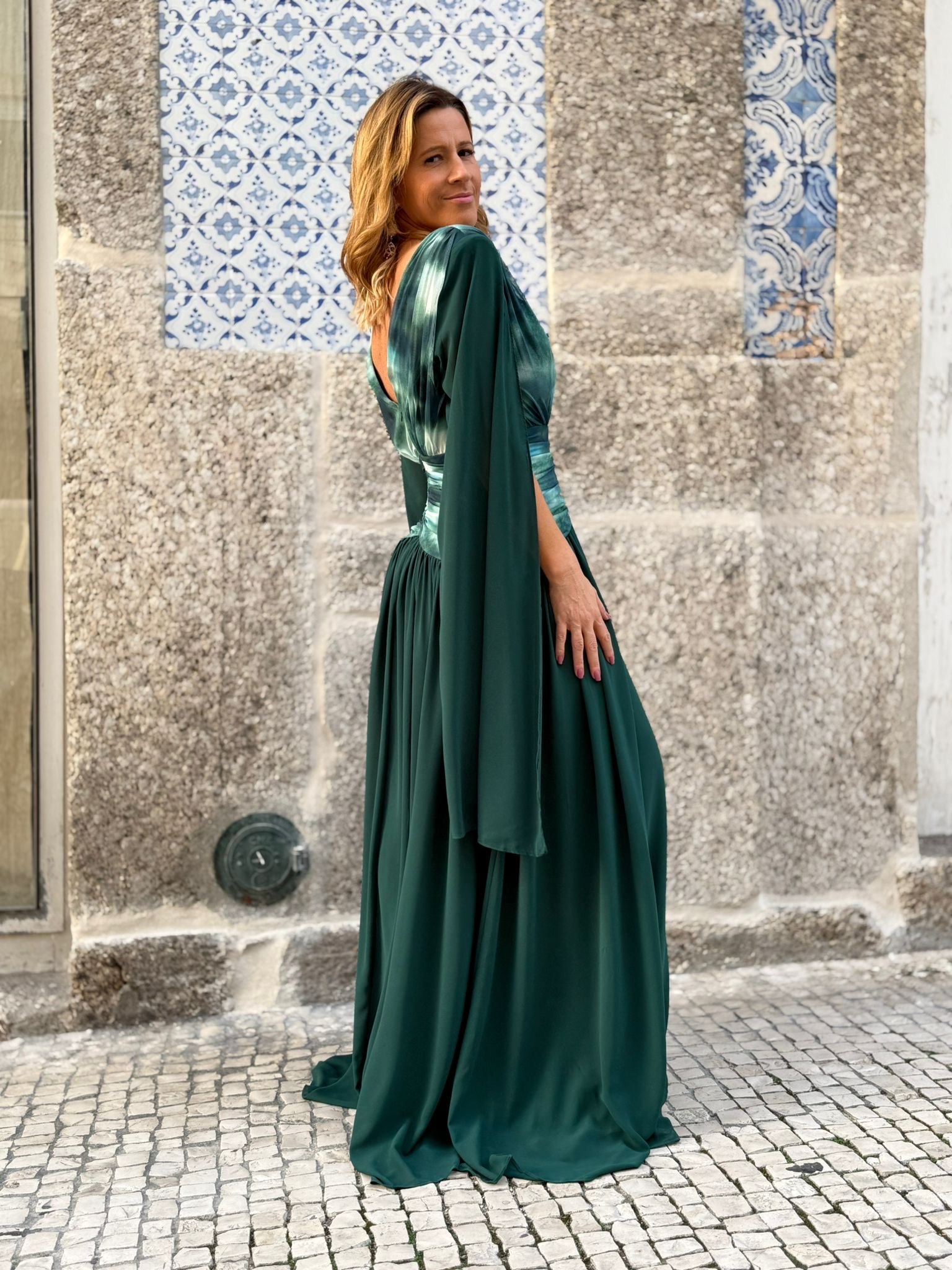 Vestido verde com mangas em capa